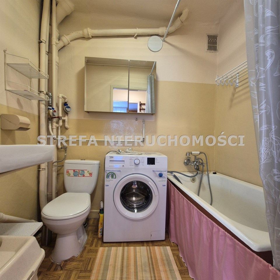 Łazienka: wanna, umywalka z armaturą, lustro, pralka, wc, oświetlenie górne