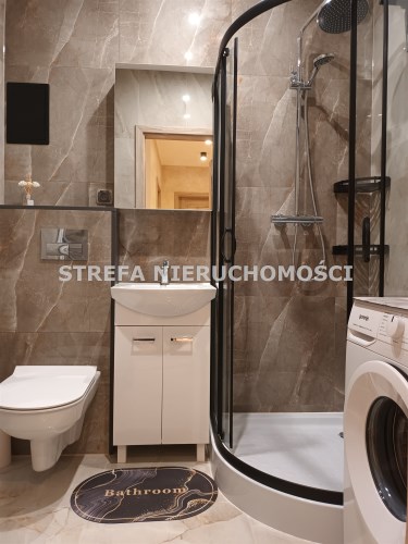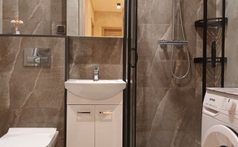 Łazienka: szafka z lustrem, pralka, prysznic, szafka pod umywalką, wc, oświetlenie